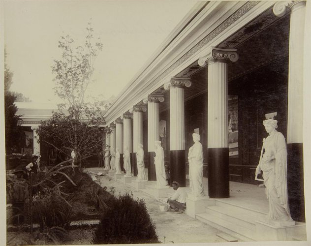 Στο περιστύλιο της πίσω πλευράς του κτίριου διακρίνονται τα μαρμάρινα γλυπτά του Κήπου ή Αίθριου των Μουσών, ανάμεσα στα οποία δεσπόζουν εννέα αγάλματα γυναικών, που αποτυπώνουν τη μορφή όσο και τα σύμβολα με τα οποία συνδέονται οι μυθολογικές αυτές θεότητες (Καλλιόπη, Κλειώ, Ευτέρπη, Θάλεια, Μελπομένη, Τερψιχόρη, Ερατώ, Πολύμνια και Ουρανία)