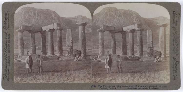 Στη φωτογραφία του 1903 παρουσιάζεται ο αρχαϊκός ναός του Απόλλωνα, ο οποίος βρίσκεται στην Αρχαία Κόρινθο. Ο φωτογράφος αποτυπώνει με τον φακό του ανθρώπους που μάλλον από την ενδυμασία τους πρόκειται για περιηγητές ταξιδιώτες – ερευνητές. Αυτοί οι άνθρωποι αρέσκονταν να φωτογραφίζονται με ιστορικά αξιοθέατα. Στο δεύτερο πλάνο της φωτογραφίας παρατηρούμε τον ναό ο οποίος είναι χτισμένος με μονολιθικούς δωρικούς κίονες. Από τους 40 που υπήρχαν, σήμερα σώζονται μόνο 7 όρθιοι σε περίοπτη θέση πάνω από τα ερείπια της αρχαίας αγοράς. Ο ναός χτίστηκε το 530 π.Χ. περίπου. Οι διαστάσεις του ναού στον στυλοβάτη είναι 53,82 Χ 21,48. Ο ναός ήταν πώρινος και καλυπτόταν από επίχρισμα (σοβά) μαρμαρόσκονης. Για να στηριχθεί η οροφή υπήρχαν και εσωτερικοί κίονες κατά μήκος του αρκετά μεγάλου σε μέγεθος σηκού, που ήταν χωρισμένος σε δύο δωμάτια και επίσης σε πρόναο και οπισθόδομο που είχαν στην πρόσοψή τους ανά δύο κίονες ανάμεσα σε παραστάδες. Ο ναός αποτελεί σήμα κατατεθέν της Κορίνθου.