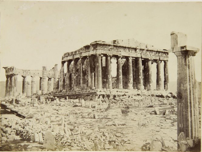 Πρόκειται για φωτογραφία του Πέτρου Μωραΐτη, στην οποία εικονίζεται η βορειοδυτική πλευρά του Παρθενώνα γύρω στα 1870. Φαίνονται οι κίονες δωρικού ρυθμού και το αέτωμα. Ο ναός που οι Αθηναίοι αφιέρωσαν στην προστάτιδα της πόλης τους, Αθηνά Παρθένο, είναι το λαμπρότερο δημιούργημα της αθηναϊκής δημοκρατίας στην περίοδο της μεγάλης ακμής της και το αρτιότερο ως προς τη σύνθεση και την εκτέλεση από τα οικοδομήματα του Ιερού Βράχου. Ο Παρθενώνας διατήρησε αυτή τη μορφή μέχρι τον 5ο αι. μ.Χ., οπότε μετατράπηκε σε ναό αφιερωμένο αρχικά στην Αγία Σοφία και αργότερα στην Παναγία, ενώ στα χρόνια της Τουρκοκρατίας έγινε τζαμί. Σήμερα ο επισκέπτης μπορεί να θαυμάσει το μαρμάρινο Παρθενώνα των χρόνων του Περικλή, σχεδιασμένο από τον Ικτίνο και τον Καλλικράτη.