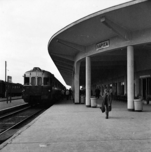 Στη φωτογραφία του Ιωάννη Λάμπρου που τράβηξε το 1961, απεικονίζεται ο σιδηροδρομικός σταθμός της Λάρισας. Εγκαινιάστηκε το 1962. Χαρακτηριστική είναι η κολωνοστοιχία που υποστηρίζει το στέγαστρο αυτό παράλληλα µε τον άξονα της γραµµής. Απουσιάζει από τις λειτουργίες του κτιρίου ο χώρος κατοικίας του σταθµάρχη.