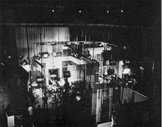 Το στούντιο Marconi-EMI στο Alexandra Palace στα 1936, στην Αγγλία. Εκείνη την εποχή τα τηλεοπτικά στούντιο ήταν φτωχά εξοπλισμένα με αποτέλεσμα να μην είναι δυνατή η παραγωγή ποιοτικών τηλεοπτικών εκπομπών. |