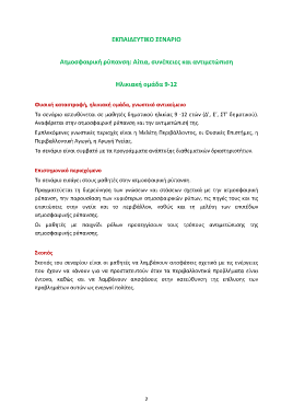 ΕΚΠΑΙΔΕΥΤΙΚΟ ΣΕΝΑΡΙΟ Ατμοσφαιρική ρύπανση: Αίτια, συνέπειες και αντιμετώπιση Ηλικιακή ομάδα 9-12 Φυσική καταστροφή, ηλικιακή ομάδα, γνωστικό αντικείμενο Το σενάριο απευθύνεται σε μαθητές δημοτικού ηλικίας 9 -12 ετών (Δ’, Ε’, ΣΤ’ δημοτικού). Αναφέρεται στην ατμοσφαιρική ρύπανση και την αντιμετώπισή της. Εμπλεκόμενες γνωστικές περιοχές είναι η Μελέτη Περιβάλλοντος, οι Φυσικές Επιστήμες, η Περιβαλλοντική Αγωγή, η Αγωγή Υγείας. Το σενάριο είναι συμβατό με τα προγράμματα ανάπτυξης διαθεματικών δραστηριοτήτων. Επιστημονικό περιεχόμενο Το σενάριο εισάγει στους μαθητές στην ατμοσφαιρική ρύπανση. Πραγματεύεται τη διερεύνηση των γνώσεων και στάσεων σχετικά με την ατμοσφαιρική ρύπανση, την παρουσίαση των κυριότερων ατμοσφαιρικών ρύπων, τις πηγές τους και τις επιπτώσεις στην υγεία και το περιβάλλον, καθώς και τη μελέτη των επιπέδων ατμοσφαιρικής ρύπανσης. Οι μαθητές με παιχνίδι ρόλων προσεγγίσουν τους τρόπους αντιμετώπισης της ατμοσφαιρικής ρύπανσης. Σκοπός Σκοπός του σεναρίου είναι οι μαθητές να λαμβάνουν αποφάσεις σχετικά με τις ενέργειες που έχουν να κάνουν για να προστατευτούν όταν τα περιβαλλοντικά προβλήματα είναι έντονα, καθώς και να λαμβάνουν αποφάσεις στην κατεύθυνση της επίλυσης των προβλημάτων αυτών ως ενεργοί πολίτες. 2