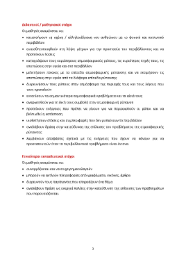 Διδακτικοί / μαθησιακοί στόχοι Οι μαθητές αναμένεται να: • κατανοήσουν τη σχέση / αλληλεπίδραση του ανθρώπου µε το φυσικό και κοινωνικό περιβάλλον • ευαισθητοποιηθούν στη λήψη μέτρων για την προστασία του περιβάλλοντος και να προτείνουν λύσεις • καταγράψουν τους κυριότερους ατμοσφαιρικούς ρύπους, τις κυριότερες πηγές τους, τις επιπτώσεις στην υγεία και στο περιβάλλον • μελετήσουν πίνακες με τα επίπεδα ατμοσφαιρικής ρύπανσης και να εκτιμήσουν τις επιπτώσεις στην υγεία από τα διάφορα επίπεδα ρύπανσης • διερευνήσουν τους ρύπους στην ατμόσφαιρα της περιοχής τους και τους λόγους που τους προκαλούν • εντοπίσουν τα σημαντικότερα ατμοσφαιρικά προβλήματα και τα αίτιά τους • αναρωτηθούν για τη δική τους συμβολή στην ατμοσφαιρική ρύπανση • προτείνουν ενέργειες που πρέπει να γίνουν για να περιοριστούν οι ρύποι και να βελτιωθεί η κατάσταση • υιοθετήσουν στάσεις και συμπεριφορές που δεν ρυπαίνουν το περιβάλλον • αναλάβουν δράση στην κατεύθυνση της επίλυσης του προβλήματος της ατμοσφαιρικής ρύπανσης • λαμβάνουν αποφάσεις σχετικά με τις ενέργειες που έχουν να κάνουν για να προστατευτούν όταν τα περιβαλλοντικά προβλήματα είναι έντονα. Γενικότεροι εκπαιδευτικοί στόχοι Οι μαθητές αναμένεται να: • συνεργάζονται και να επιχειρηματολογούν • μπορούν να αντλούν πληροφορίες από γραφήματα, εικόνες, άρθρα • διερευνούν τους παράγοντες που επηρεάζουν ένα θέμα • αναλάβουν δράση ως ενεργοί πολίτες στην κατεύθυνση της επίλυσης των προβλημάτων που παρουσιάζονται. 3