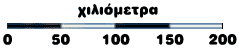 Εδώ η κλίμακα αναπαριστάται με μια ευθεία χωρισμένη σε ίσα τμήματα. Κάθε τμήμα αντιστοιχεί σε ευθεία γραμμή στην επιφάνεια της γης. Στο παράδειγμα κάθε μέρος είναι 50 χιλιόμετρα. |