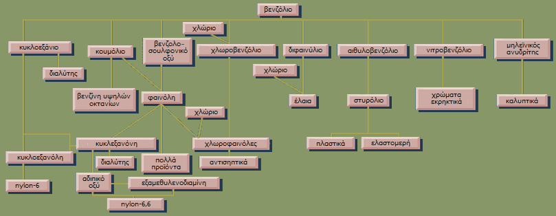 Αποτελεί την πρώτη ύλη ή την ενδιάμεση χημική ένωση για την παρασκευή πλήθους αρωματικών ενώσεων όπως: στυρόλιο, φαινόλη, νιτροβενζόλιο και ανιλίνης, αλκυλοβενζόλια, χλωροβενζολία, αλλά και μη αρωματικών ενώσεων, όπως το κυκλοεξάνιο. Με τη σειρά τους αυτές οι χημικές αυτές ενώσεις χρησιμοποιούνται στη χημική βιομηχανία για την παραγωγή μια αφθονίας υλικών και ουσιών όπως: πλαστικά, ρητίνες, χρώματα, εντομοκτόνα, φαρμακευτικά προϊόντα κ.λπ.
