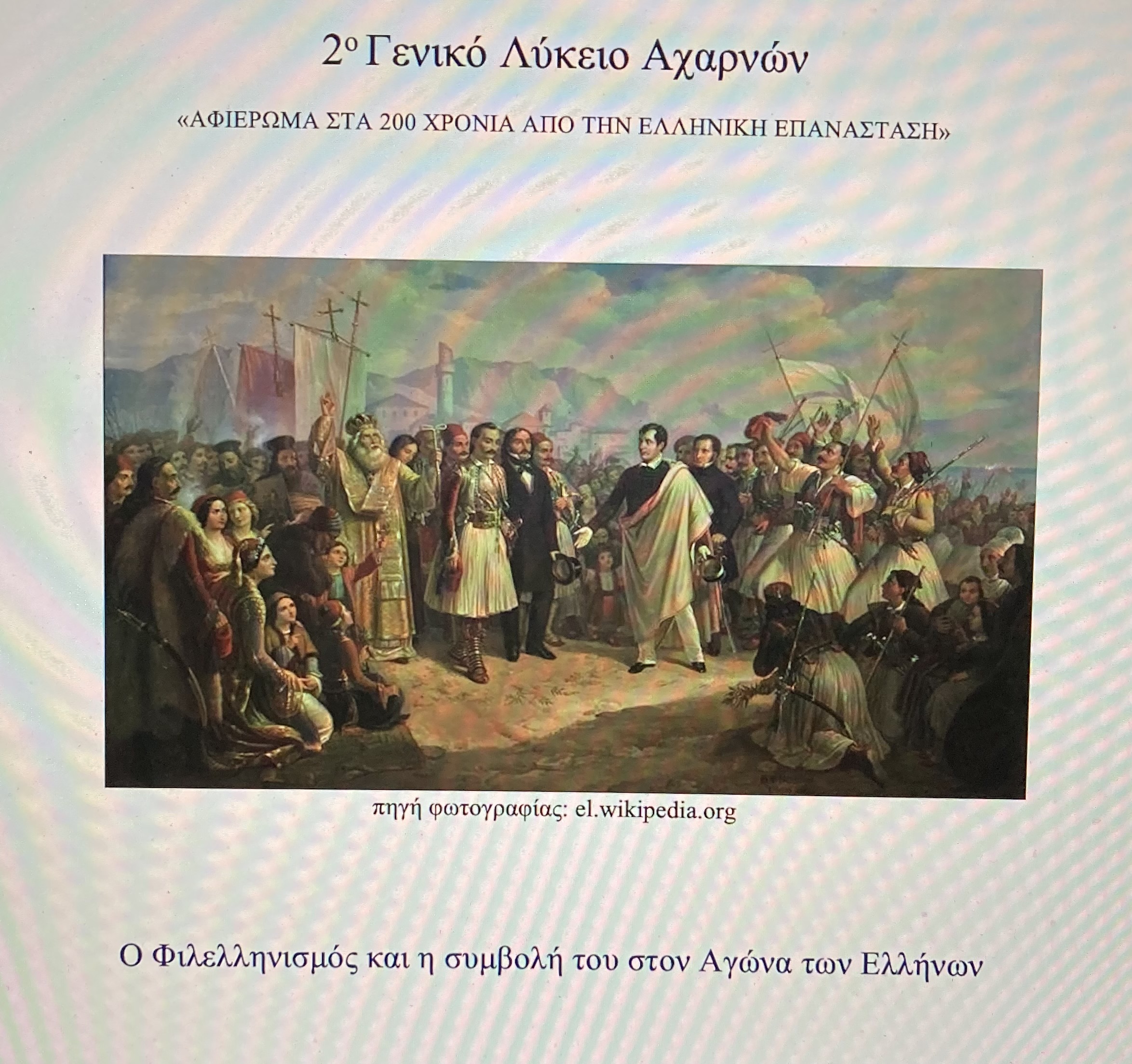 Η παρούσα εργασία παρουσιάστηκε στα πλαίσια δράσης του 2ου ΓΕΝΙΚΟΥ ΛΥΚΕΙΟΥ ΑΧΑΡΝΩΝ για τα 200 χρόνια από την Ελληνική Επανάσταση του 1821. Οι μαθητές εξέτασαν τη συμβολή του φιλελληνισμού στην επιτυχή ελληνική Επανάσταση και παρουσίασαν το προφίλ σημαντικών Φιλελλήνων που βοήθησαν ηθικά, οικονομικά ή με τη δική τους παρουσία τον Αγώνα των Ελλήνων.