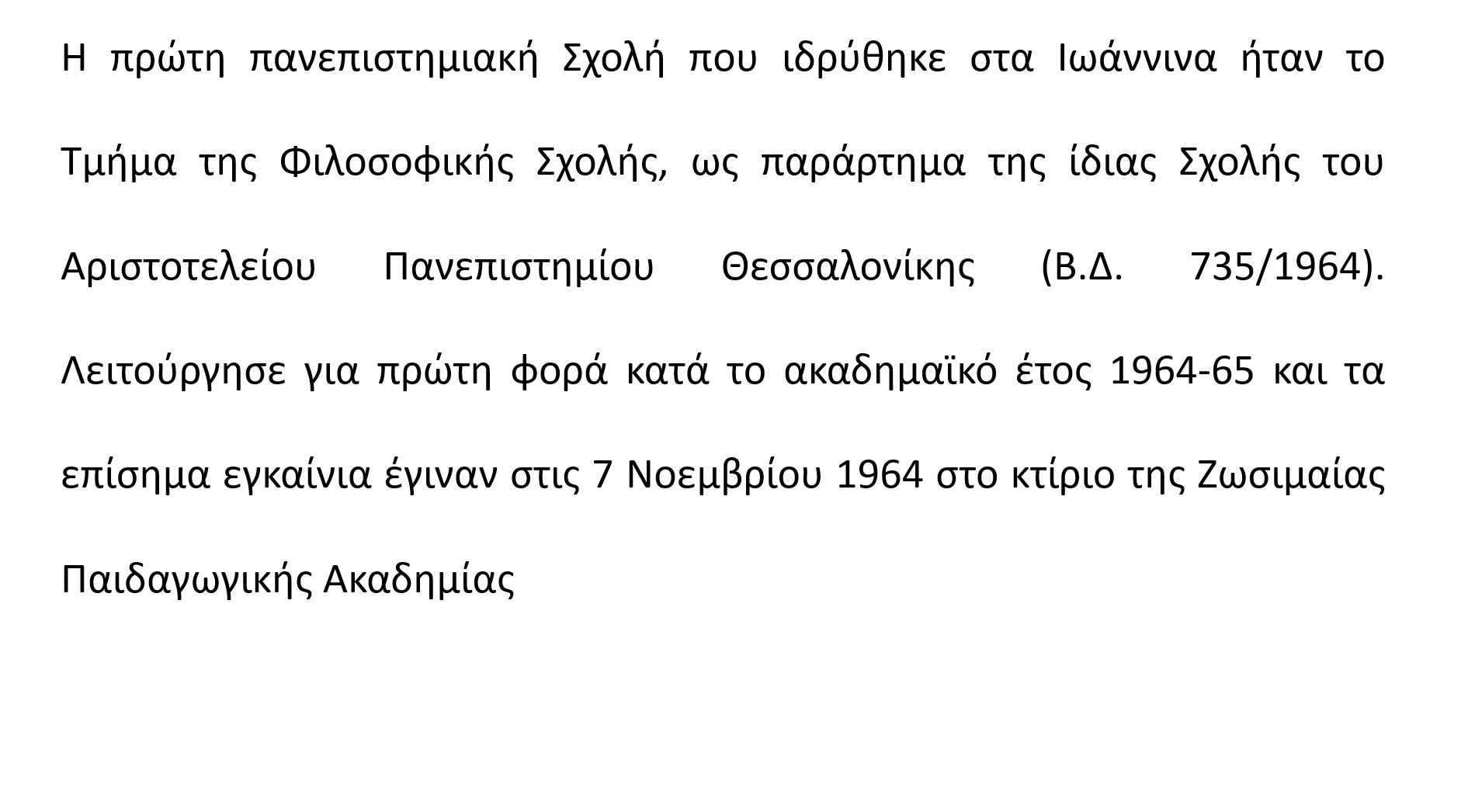 Η πρώτη πανεπιστημιακή Σχολή που ιδρύθηκε στα Ιωάννινα ήταν το Τμήμα της Φιλοσοφικής Σχολής, ως παράρτημα της ίδιας Σχολής του Αριστοτελείου Πανεπιστημίου Θεσσαλονίκης (Β.Δ. 735/1964). Λειτούργησε για πρώτη φορά κατά το ακαδημαϊκό έτος 1964-65 και τα επίσημα εγκαίνια έγιναν στις 7 Νοεμβρίου 1964 στο κτίριο της Ζωσιμαίας Παιδαγωγικής Ακαδημίας, κτίριο στο οποίο σήμερα στεγάζεται το 4ο ΓΕΛ Ιωαννίνων «ΑΚΑΔΗΜΙΑ», το σχολείο μας.