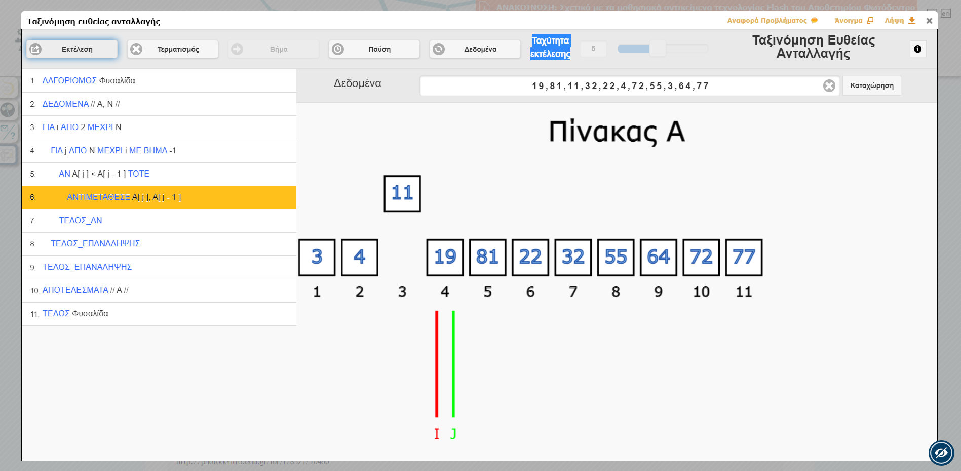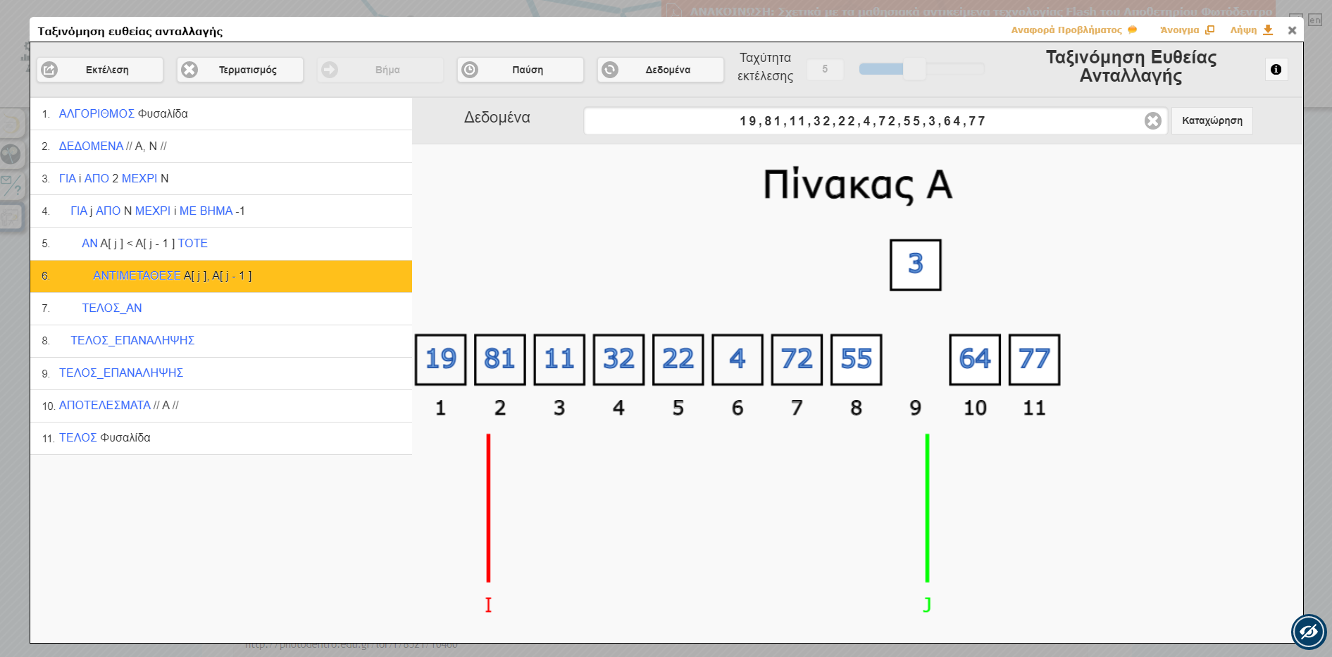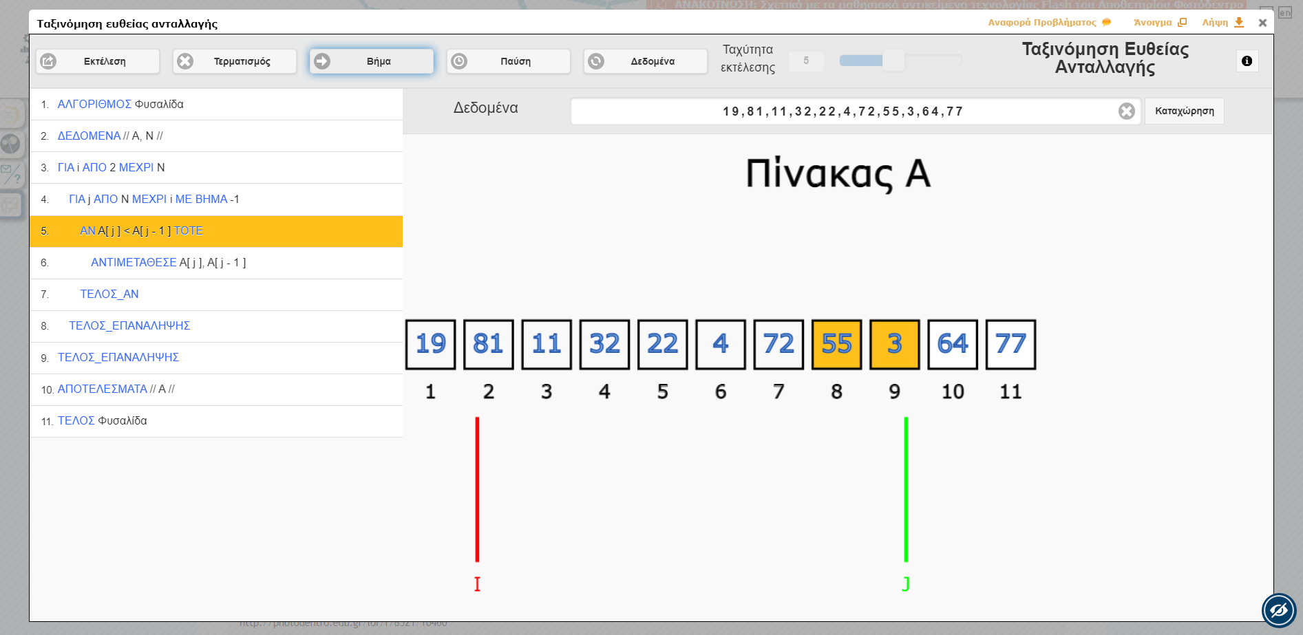 Όπως φαίνεται στις παρακάτω οθόνες, κατά τη σύγκριση δύο στοιχείων του πίνακα (π.χ. του 9ου και 8ου στοιχείου) ξεχωρίζουν με διαφορετικό χρώμα, τόσο τα στοιχεία που συγκρίνονται, όσο και οι εντολές ελέγχου και αντιμετάθεσης. Στη συνέχεια δείχνεται δυναμικά η αντιμετάθεση των στοιχείων με τιμές 3 και 55.