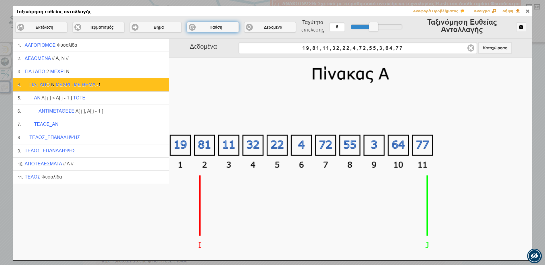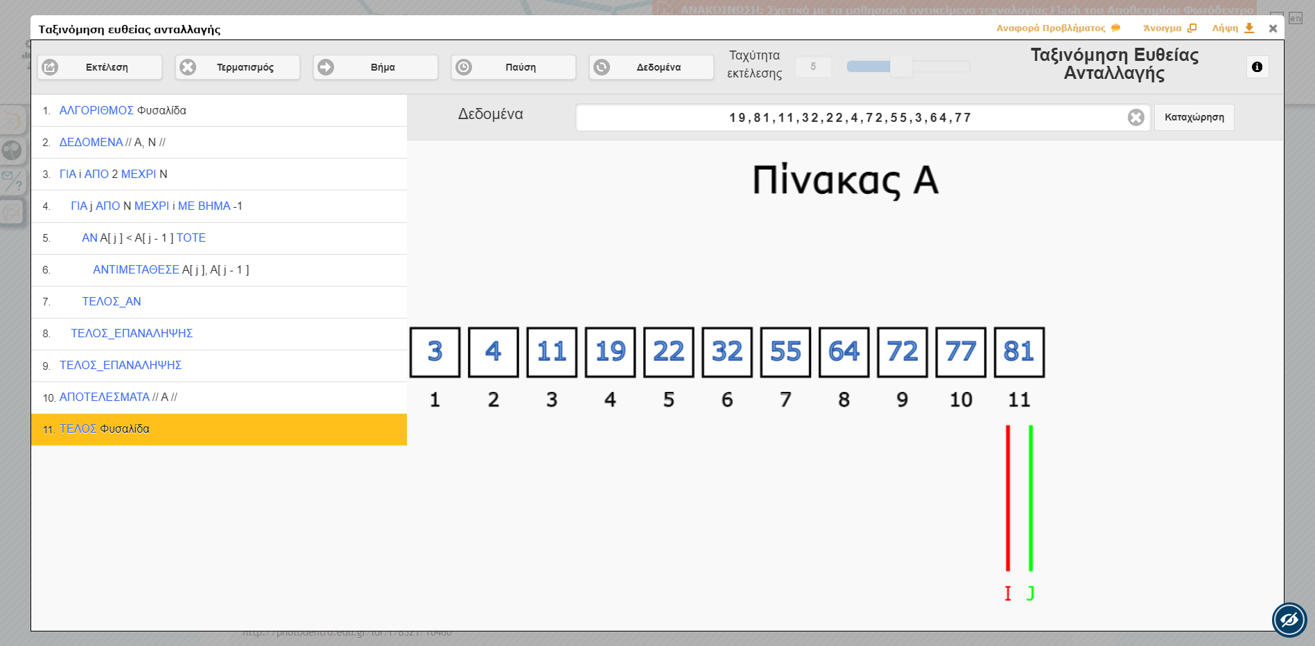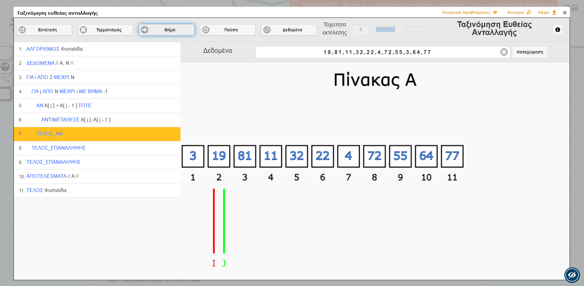 Όπως φαίνεται στις παρακάτω οθόνες, κατά τη σύγκριση δύο στοιχείων του πίνακα (π.χ. του 9ου και 8ου στοιχείου) ξεχωρίζουν με διαφορετικό χρώμα, τόσο τα στοιχεία που συγκρίνονται, όσο και οι εντολές ελέγχου και αντιμετάθεσης. Στη συνέχεια δείχνεται δυναμικά η αντιμετάθεση των στοιχείων με τιμές 3 και 55.