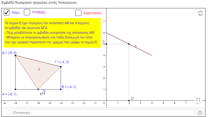 Οι μαθητές και μαθήτριες μετακινούν σημείο Μ που αποτελεί μια κορυφή ενός τριγώνου και έτσι μεταβάλλεται το εμβαδόν του τριγώνου, προσπαθούν να βρουν τον τύπο αυτής ενώ παράλληλα έχουν την πληροφορία για τη γραφικής της παράσταση.