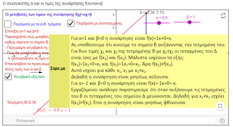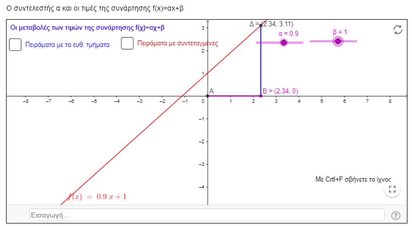 Είδος δραστηριότητας>>Αρχικά οι μαθητές και οι μαθήτριες πειραματίζονται με τις τιμές των δρομέων α και β χρησιμοποιώντας το πρώτο μικροπείραμα και προσπαθούν να συνδέσουν την κλίση της ευθείας με την τιμή του α, κάνουν υπολογισμούς και ελέγχουν τις εικασίες τους.