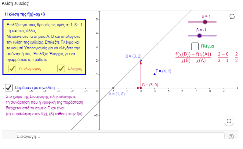 Οι μαθητές στο Γυμνάσιο έχουν διαπραγματευθεί τη γραφική παράσταση της ευθείας y=αx+β, εδώ θα διερευνήσουν το ρόλο που έχουν οι παράμετροι α και β, και κυρίως η α, στη γραφική παράσταση της συνάρτησης f(x)=αx+β και θα κληθούν να περιγράψουν τι επιφέρει η μεταβολή της α στην ευθεία. Μέσα από κατάλληλες δραστηριόττες και αξιοποιώντας αντίστοιχο ψηφιακό υλικό οι μαθητές θα παρατηρήσουν πως μεταβάλλεται η γραφική παράσταση όταν μεταβάλλεται η ανεξάρτητη μεταβλητή, σε διαφορετικά πλαίσια και θα αναζητήσουν το ρόλο της παραμέτρου α σε αυτές τις μεταβολές. Στόχος είναι να συνδέσουν την κλίση της ευθείας με τη γωνία τριγώνου, αλλα και με άλλα μαθηματικά αντικείμενα (π.χ. συντεταγμένες σημείων), μέσα από την παρατήρηση των παραπάνω μεταβολών και στη συνέχεια να εμπλακούν με επίλυση προβλημάτων και κυρίως χειρισμό σχετικών μοντέλων και περιγραφή τους με την έννοια της κλίσης.