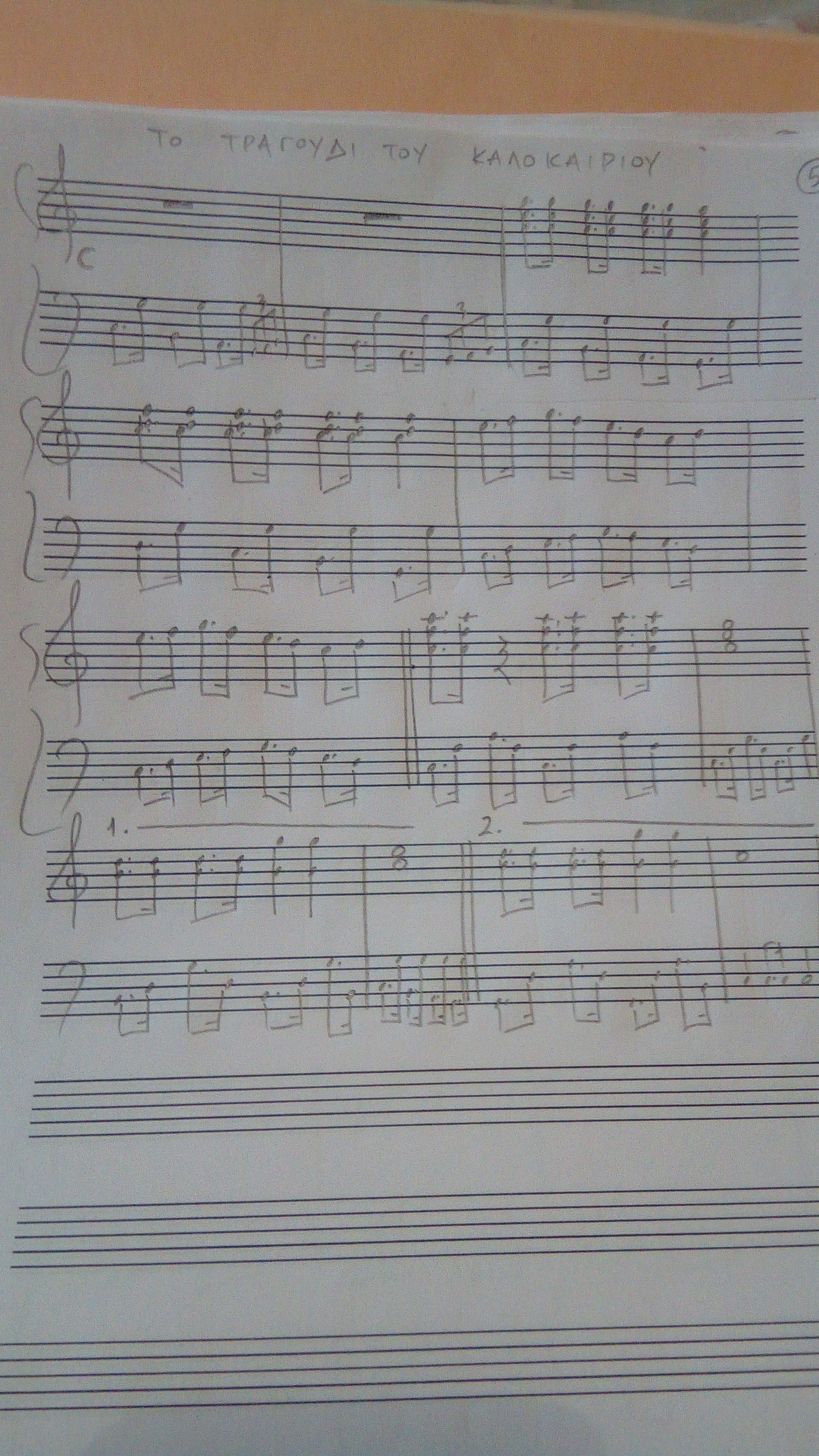 Δράση 11η :Επόμενος σταθμός μια πόλη όπου οι άνθρωποι ήταν ξαπλωμένοι κάτω από τεράστιες πολύχρωμες ομπρέλες, εξαντλημένοι από την πολλή ζέστη. Τα παιδιά θέλησαν να τους βοηθήσουν. Στην αρχή, βρήκαν το γρίφο της πόλης, που αποτελούταν από τις παρακάτω λέξεις: " Ο Ι ππόκαμπος και ο Κάβουρας, Ραστώνη στο Ανάκτορο, αυτή είναι ζωή! ΟΛίβας ξεφυσάει, Καράβι στον Αφρό, Ιδρώτας τον Καπετάνιο τυλίγει στο λεπτό. Κρατώντας ένα Όστρακο που λέγεται μπορού, δυνατά σ΄εμέ φωνάζει ποτέ μην πας αλλού!" Τα γράμματα σχημάτιζαν τη λέξη Καλοκαίρι. Η πύλη άνοιξε και μπροστά τους ξεπρόβαλε το ίδιο το Καλοκαίρι, που τους υποδέχτηκε με χαρά μα και με προβληματισμό, μιας και τα παιδιά συνοδεύονταν από τον αδερφό του το Χειμώνα. Αφού εξήγησαν στο Καλοκαίρι το λόγο του ταξιδιού τους, του χάρισαν το τελευταίο δώρο του γέροντα Αρίσταρχου, μια σταγόνα νερού, η οποία, όπου έπεφτε δημιουργούσε γάργαρο νερό για να δροσίζονται οι άνθρωποι. Το Καλοκαίρι, έκανε δώρο στα παιδιά το κλειδί της Ταπεινότητας, που με αυτό ξεκλείδωσαν το ξύλινο σεντούκι που ήταν κρυμμένο στην καυτή άμμο για χρόνια. Ήταν το τελευταίο κομμάτι μιας μουσικής παρτιτούρας και είχε ολοκληρώσει ένα μουσικό χάρτη. Τα λόγια του ήταν τα εξής: " Τέρμα τώρα το σχολειό, τρέχω αμέσως σε νερό, μες στο κύμα πλατσουρίζω, κάστρο μες την άμμο χτίζω, με καπέλο με γυαλιά, με καρπούζι με πεπόνι, με τζιτζίκι στο μπαλκόνι. Να το! Δέστε το παιδιά, καλοκαίρι! Τι χαρά (δις). Σκοπός: Να αυτοσχεδιάσουν με μουσικά όργανα, να μιμηθούν χαρακτηριστικά του καλοκαιριού κινητικά, μουσικά, να εκφραστούν, να χαρούν.