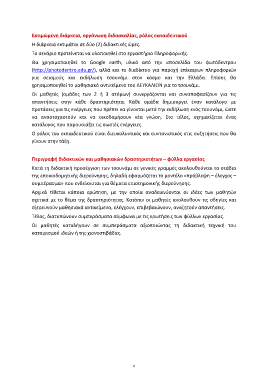 Εκτιμώμενη διάρκεια, οργάνωση διδασκαλίας, ρόλος εκπαιδευτικού Η διάρκεια εκτιμάται σε δύο (2) διδακτικές ώρες. Το σενάριο προτείνεται να υλοποιηθεί στο εργαστήριο Πληροφορικής. Θα χρησιμοποιηθεί το Google earth, υλικό από την ιστοσελίδα του φωτόδεντρου (http://photodentro.edu.gr/), αλλά και το διαδίκτυο για παροχή επίκαιρων πληροφοριών για σεισμούς και εκδήλωση τσουνάμι στον κόσμο και την Ελλάδα. Επίσης θα χρησιμοποιηθεί το μαθησιακό αντικείμενο του ΔΕΥΚΑΛΙΩΝ για το τσουνάμι. Οι μαθητές (ομάδες των 2 ή 3 ατόμων) συνεργάζονται και συναποφασίζουν για τις απαντήσεις στην κάθε δραστηριότητα. Κάθε ομάδα δημιουργεί έναν κατάλογο με προτάσεις για τις ενέργειες που πρέπει να γίνονται μετά την εκδήλωση ενός τσουνάμι, ώστε να αναστοχαστούν και να οικοδομήσουν νέα γνώση. Στο τέλος, σχηματίζεται ένας κατάλογος που παρουσιάζει τις σωστές ενέργειες. Ο ρόλος του εκπαιδευτικού είναι διευκολυντικός και συντονιστικός στις συζητήσεις που θα γίνουν στην τάξη. Περιγραφή διδακτικών και μαθησιακών δραστηριοτήτων – φύλλα εργασίας Κατά τη διδακτική προσέγγιση των τσουνάμι σε γενικές γραμμές ακολουθούνται τα στάδια της εποικοδομητικής διερεύνησης, δηλαδή εφαρμόζεται το μοντέλο «πρόβλεψη – έλεγχος – συμπέρασμα» που ενδείκνυται για θέματα επιστημονικής διερεύνησης. Αρχικά τίθεται κάποια ερώτηση, με την οποία αναδεικνύονται οι ιδέες των μαθητών σχετικά με το θέμα της δραστηριότητας. Κατόπιν οι μαθητές ακολουθούν τις οδηγίες και εξερευνούν μαθησιακά αντικείμενα, ελέγχουν, επιβεβαιώνουν, αναζητούν απαντήσεις. Τέλος, διατυπώνουν συμπεράσματα σύμφωνα με τις ερωτήσεις των φύλλων εργασίας. Οι μαθητές καταλήγουν σε συμπεράσματα αξιοποιώντας τη διδακτική τεχνική του καταιγισμού ιδεών ή της χιονοστιβάδας. 4