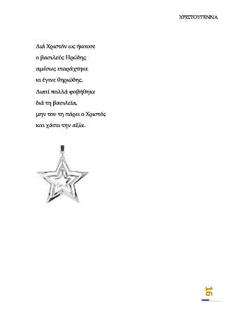 ΧΡΙΣΤΟΥΓΕΝΝΑ Διά Χριστόν ως ήκουσε ο βασιλεύς Ηρώδης αμέσως εταράχτηκε κι έγινε θηριώδης. Διατί πολλά φοβήθηκε διά τη βασιλεία, μην του τη πάρει ο Χριστός και χάσει την αξία. 16