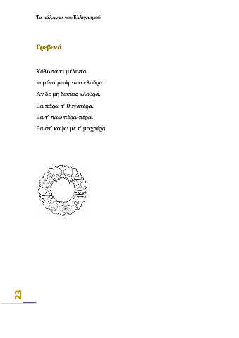 Τα κάλαντα του Ελληνισμού Γρεβενά Κόλιντα κι μέλιντα κι μένα μπάμπου κλούρα. Αν δε μη δώσεις κλούρα, θα πάρω τ’ θυγατέρα, θα τ’ πάω πέρα-πέρα, θα στ’ κόψω με τ’ μαχαίρα. 23
