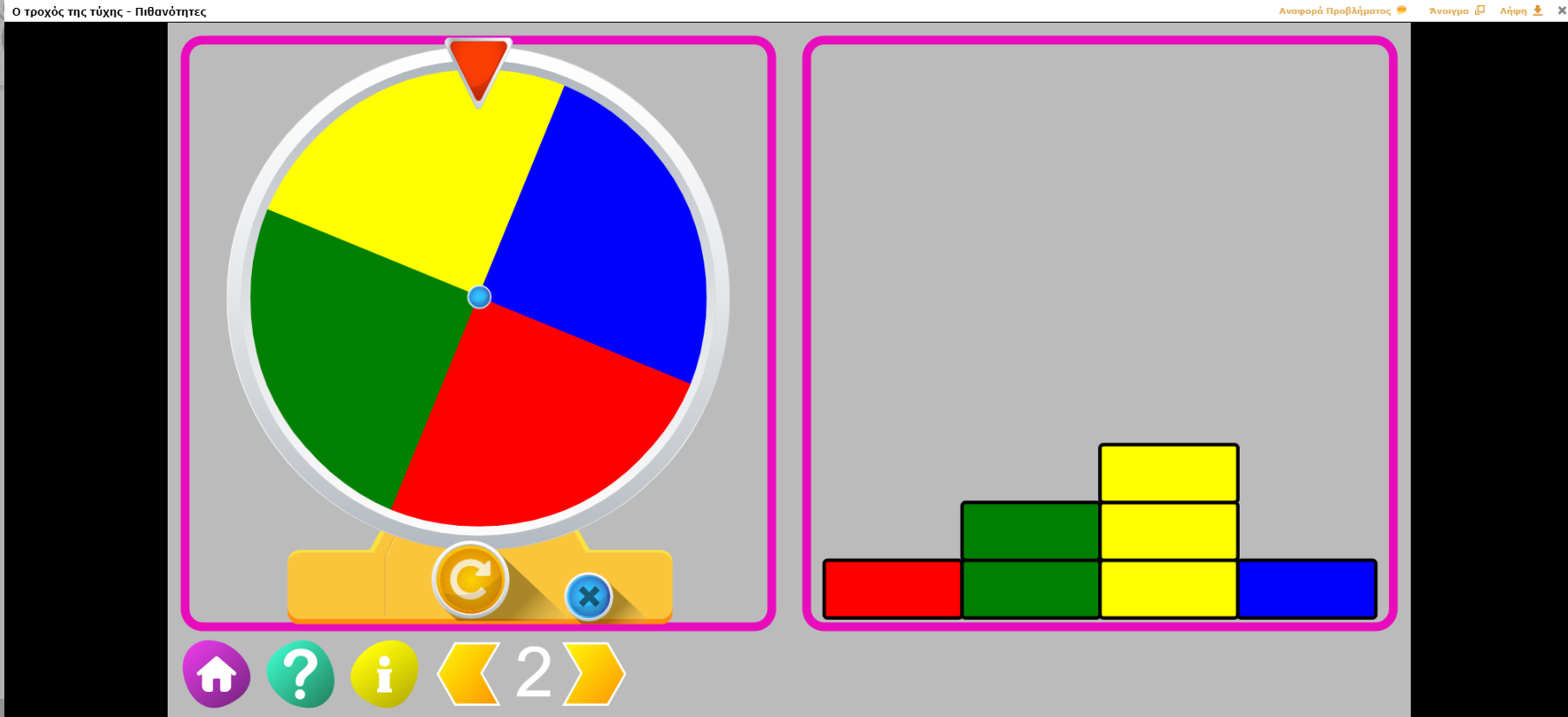Παράλληλα, υπάρχει και εναλλακτικός τρόπος αναπαράστασης των αποτελεσμάτων, με τη δημιουργία ραβδογράμματος στην οθόνη του μαθησιακού αντικειμένου ενισχύει τη σκέψη των παιδιών ώστε να μπορούν να περιγράψουν αποτελεσματικά όλα τα πιθανά ενδεχόμενα του δειγματικού χώρου (αντιστοίχιση χρωμάτων τροχού της τύχης και των ράβδων στο ραβδόγραμμα). |